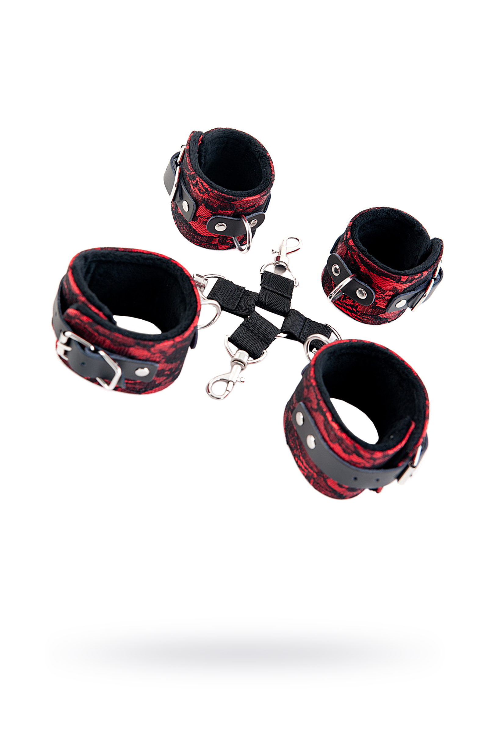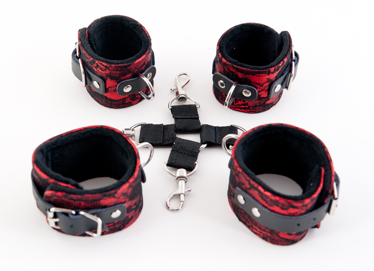 Бондажный комплект из серии Marcus от ToyFa с гламурной отделкой из нежного кружева роскошное сочетание, чтобы в любой ситуации чувствовать себя неотразимой. С этим комплектом ты обездвижена и находишься в полной власти своего господина. Сцепка наручников и оков, пристегнутых к общему кольцу, ограничивает свободу вашего партнера. Меняйте положение по своему желанию: фиксируйте руки и ноги партнетра впереди и сзади. Карабины и цепочки позволяют убрать кольцо и превратить сцепку в наручники и оковы.