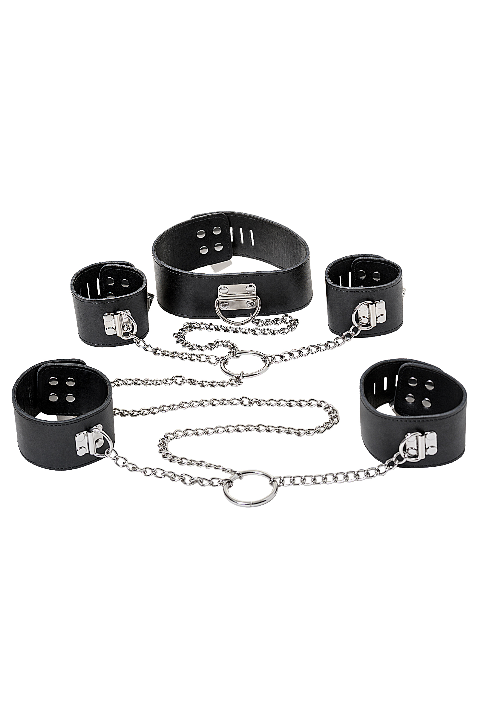 Бондажный комплект из коллекции аксессуаров для БДСМ ToyFa Theatre, Кожаный бондажный набор, фиксирующий шею, руки и ноги. Наручники и оковы на ноги, соединенные металлической цепочкой. Расстояние между наручниками и оковами по 25см, цепочка между руками и ногами 70см. Наручники и оковы фиксируются замками. Общая цепь не позволяет полностью распрямиться человеку среднего и выше среднего роста.Включите бурную фантазию и экспериментируйте.Превосходный аксессуар, который поможет разнообразить интимные отношения.